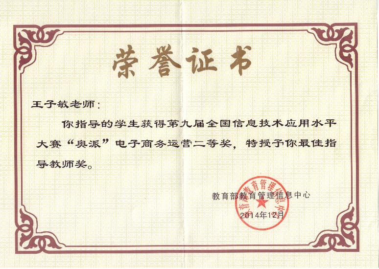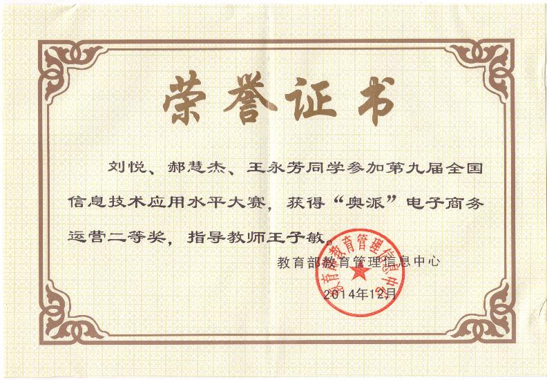 日前,第九届全国信息技术应用水平大赛在北京航空航天大学举行,williamhill中文王子敏老师指导的 13级经济学专业同学刘悦、郝慧杰和管理学院13级电子商务专业王永芳同学组成的代表队成功进入决赛,在“奥派电子商务运营”科目的决赛中,经过上机与现场答辩环节的激烈竞争,最终获得了第九届全国信息技术应用水平大赛二等奖,王子敏老师获最佳指导教师奖。