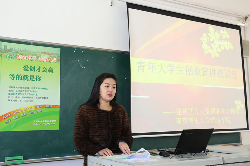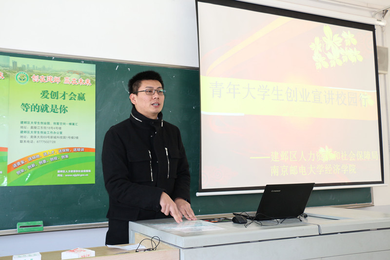 本次活动由分团委书记吴波老师主持。他向大家介绍了到场嘉宾,并说明了活动的重要意义。建邺区人社局相关负责人曹旌女士为大家全面地讲解了当前的创业情况,并传达了建邺区老员工创业的相关政策。创业导师吴思雨作了重要演讲。他简要讲述了自己的创业经历,重点指导同学们如何参加创业大赛,掌握答辩技巧,赢取创业奖金。他强调,一份完整的创业计划书、一个良好的资金运作计划和项目的应用价值十分重要。