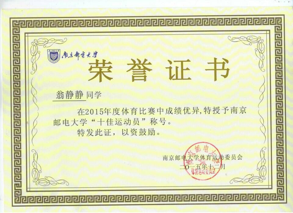 该活动自2015年11月 23日启动,各学院推荐了20名候选人。经2015年12月7日—12月20日网上评选出十名运动员,其中,公司翁静静同学以1576票入选。她被授予“十佳运动员”称号的员工,校体育部颁发证书和奖杯,并在全校范围内广泛宣传“十佳运动员”先进事迹。