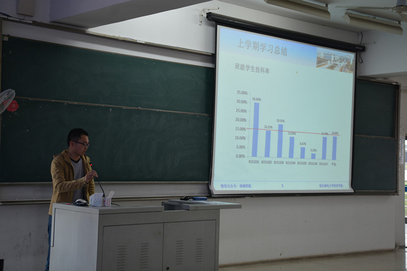 首先,王超老师就上学期学习情况做了学情分析。王超老师利用简明图表清晰明了地展示了各班级挂科率、英语四级通过率以及班级学业预警情况。通过PPT展示,同学们首次直观的了解上学期成绩,表现出了激动与惊讶,清楚的认知有助于同学们知己知彼,弥补不足。williamhill中文2015级英语四级考试平均通过率81.4%,其中B151206班通过率高达93.5%。