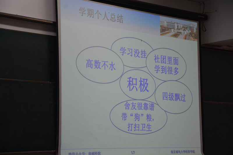 最后,王老师针对同学们的上学期个人总结汇总了两个词。第一个词是“后悔”,部分同学们反映上学期学习没学好、寝室卫生没收拾好、寝室关系没处好、班级活动没积极参加等等。第二个词是“积极”,有的同学说,学习没挂、高数不水、四级飘过、社团里学到很多、舍友很靠谱等,这些积极的一面就是给自己最好的动力,王老师希望大家继续努力。