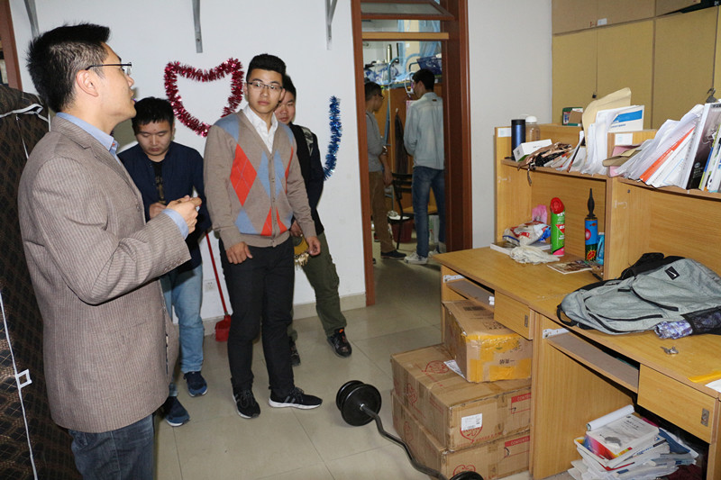 检查结果表明男生宿舍卫生及安全总体状况良好,做到了地面干净、桌面整洁、安全用电但仍有部分宿舍存在未常开窗通风,宿舍异味严重、宿舍无人但是电源未切断、宿舍个人内务不整、物品乱堆乱放和存在卫生死角等问题。吴波老师对这些宿舍提出了宿舍整改意见,责令其尽快整改,并将在随后进行不定期检查,以确保其宿舍卫生得到良好改善、用电安全得到有效保证。