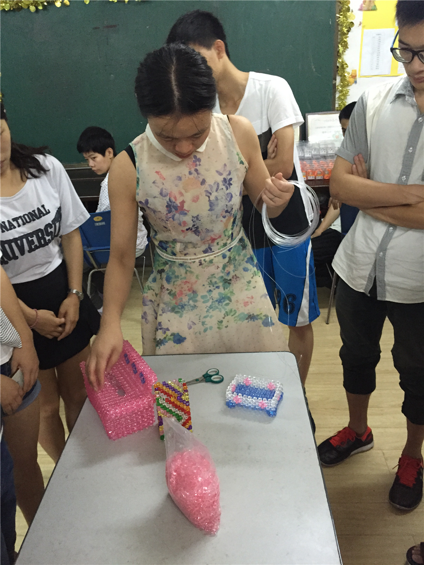 随后,在志愿者和学员们相互熟悉之后,博爱中心的负责人王老师给我们分配了任务——制作手工艺品:用小珠子和线做成简单的生活用品,然后再将所学的东西一对一耐心教给学员,尽管进程缓慢,学员学习起来比较困难,制作起来比较生疏,但他们虚心好学,互相帮助,逐渐摸清了整个制作流程,能够自己顺利完成基本的制作步骤。