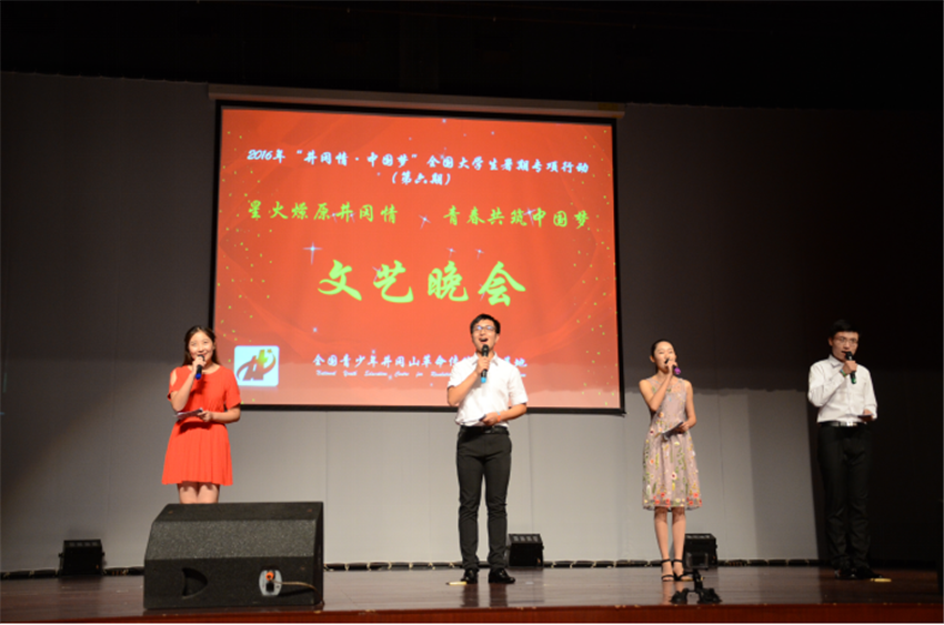 2016年“井冈情.中国梦”全国老员工暑期专项行动(第六期)“星火燎原井冈情 青春共筑中国梦”文艺晚会于8月16日晚在井冈山革命教育基地综合楼报告厅举行。晚会以校际联合文艺汇演的方式呈现,来自复旦大学、南京农业大学、中国科学技术大学等20多所高校的老员工联袂奉献了一台精彩的演出。威廉希尔“邮梦井冈”暑期社会实践团队成员参与其中。