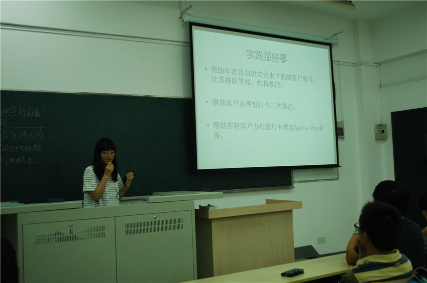 活动伊始,参加交流展示会的5支优秀实践团队和五位优秀实践个人通过抽签确定了上台展示顺序。公司派出的“井冈情·邮子梦”暑期实践团队前往井冈山革命传统教育基地,展开实地调研,领悟革命精神;龙狮团代表队前往广东佛山学习南狮文化,在借鉴创新的基础上不断提高龙狮团的技巧和表演水平;沃创社参加了联通公司举办的夏令营活动,通过素质拓展活动获得了丰富的实战经验,收获了友谊;青协前往南京博爱安养庇护中心进行志愿活动,关爱残障人士,与爱同行;统计社的市调小组则深入南京市进行入户访问,增加了社会调查的阅历、磨练了意志、培养了实践能力。暑期实践优秀个人有的去贫困地区支教,有的去银行实习,有的去国外游学,还有的进行社区志愿服务,他们通过精心准备的ppt,与其他同学分享自己在暑期实践的收获与感悟,并积极回答同学们的提问。