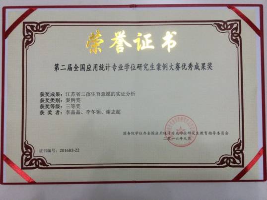 2016全国应用统计专业学位研究生案例大赛成绩近日揭晓,公司黄宝凤教授担任指导教师,李晶晶、李冬领等三位同学参赛的《江苏省二孩生育意愿的实证分析》案例获得三等奖。