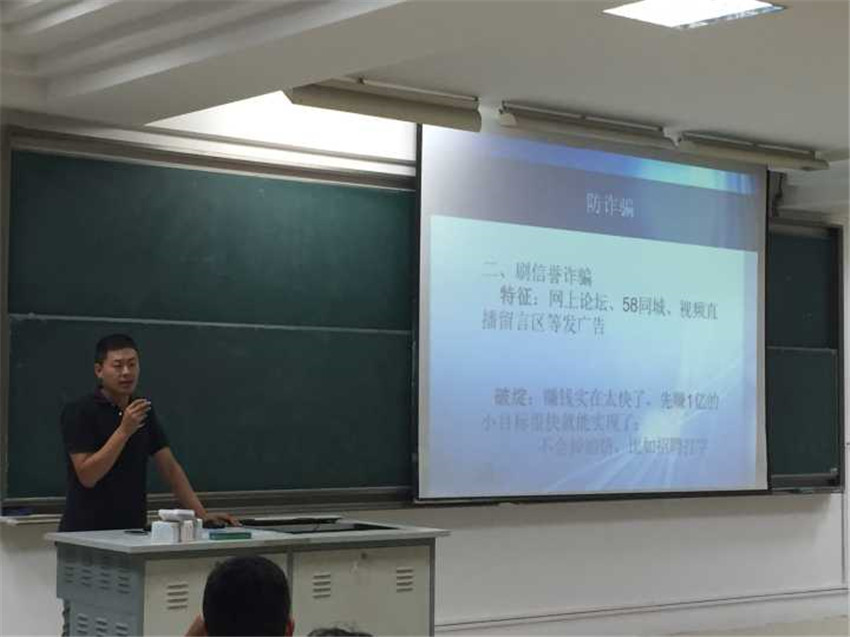 讲座以校园诈骗为话题展开,详细介绍了多种常见的校园诈骗手段,张老师凭借多年来积攒的对于此类事件的经验,以真实的事例与生动的演讲,让同学们在愉悦的氛围下了解到花样百出的骗术和实用有效的防骗手法。讲座还对大一新生的财物保管做出了提醒,给予了很多建议,例如自行车的停放、宿舍贵重财物的安放、食堂用餐时随身物品的携带等等,建议切实,细致的渗透到新生校园生活的各个方面。