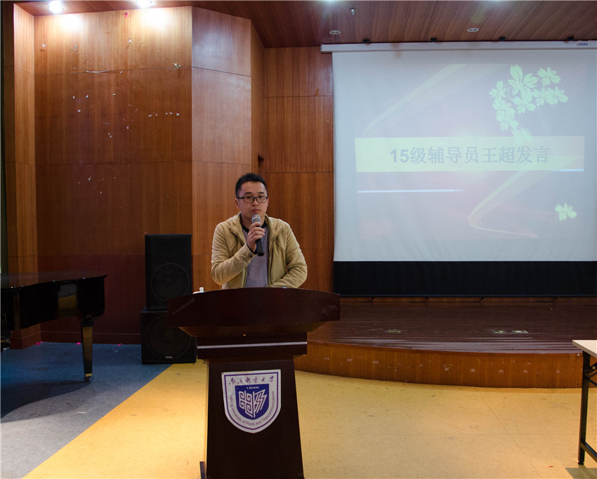 随后,2015级辅导员王超老师发言。他向这次培训班以及青共校干训班中顺利结业的同学们表示祝贺。他强调了近期教学评估工作的重要性,希望同学们能够积极配合,严于律己,以身作则,遵守校纪校规,以最好的状态去迎接下个月的教学评估和今后的的学习生活。