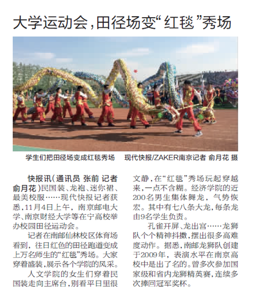 11月4日上午,威廉希尔在仙林校区体育场举办第47届运动会。开幕式上,公司同学精神抖擞、斗志昂扬,迈着整齐的步伐走过主席台,富有特色的龙狮队伍在朝阳下熠熠生辉,成为开幕式里一道靓丽的风景线。在表演环节,老员工龙狮团带来了舞龙舞狮表演《盛世华章太极舞龙》,升龙腾云,翻身振翼;九龙齐舞,变幻莫测。他们精彩演绎了平盘波浪、飞龙在天等一系列高难度动作,赢得了现场师生的阵阵掌声。现代快报进行了相关报道。
