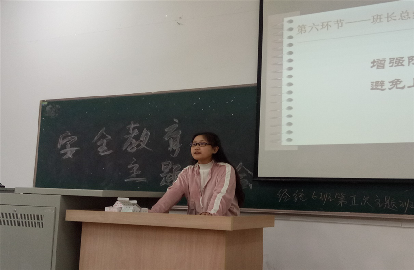 最后由班长总结发言。安全教育并不仅仅是空话,是必须切实落实在我们生活的方方面面中的。此次班会通过安全手册、实际案例和视频的结合,为我们上了深刻而生动的一课。经统六班的同学会将安全问题牢记心间,此次班会圆满完成。