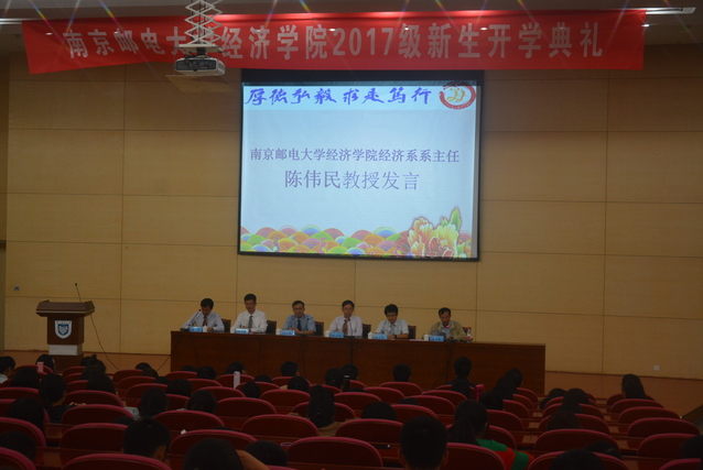 经济系系主任陈伟民教授作为教师代表进行了发言,虽然他的女儿不在南邮上大学,但同样是2017级新生家长的他字里行间都是教师与家长对员工们的殷切期盼,希望同学们能够学会独立,收获成长;快乐学习,收获知识;学会共处,收获友情。
