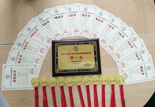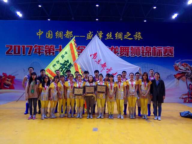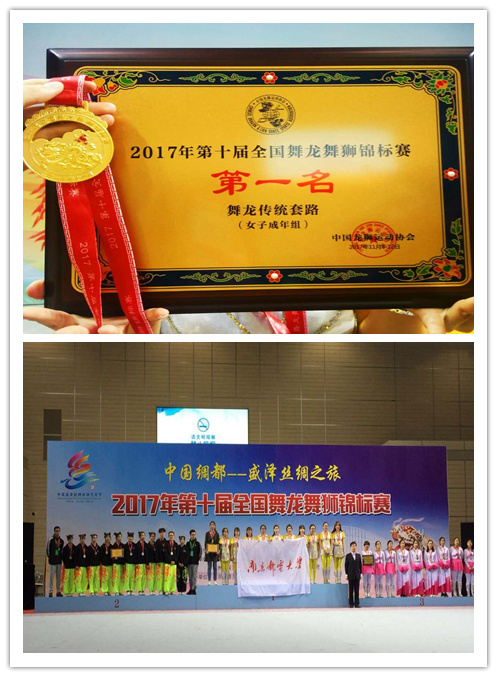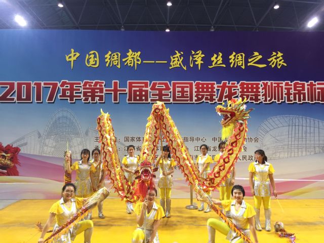 此次参赛的队员全部来自公司选修课《老员工舞龙》班上的同学,在校团委、体育部和公司领导的大力支持下,在董军老师的悉心指导下,公司龙狮团2017年5月夺得江苏省老员工龙狮精英赛女子传统舞龙冠军。为备战此次赛事,龙狮团针对目前国内各方龙狮发展的现状,认真分析研判,把主攻方向定在科技创新、套路编排和艺术表现上,尤其是在传统舞龙环节,所用器械均为自制,改进了首创的飞天舞龙,编排上将小巧的彩虹龙和五珠龙结合起来,糅合了健美操和民族舞的元素,增强了韵律感和表现力。同时,队员们利用节假日和业余时间刻苦训练,克服了时间紧,强度大、任务重、伤病多、经费少、设备缺等诸多困难,功夫不负有心人,在为期4天的比赛里,队员们团结协作,密切配合,活灵活现地将各种编排和套路完美地展现出来,一曲《飞天圆梦》技惊四座,飘逸洒脱,赏心悦目,充分展示了龙的精、气、神、韵,赢得评委认可和观众的阵阵掌声,最终以8.99分夺得冠军。