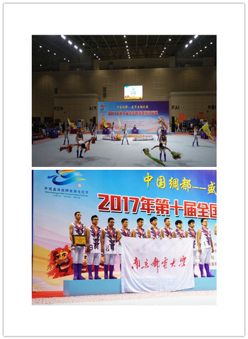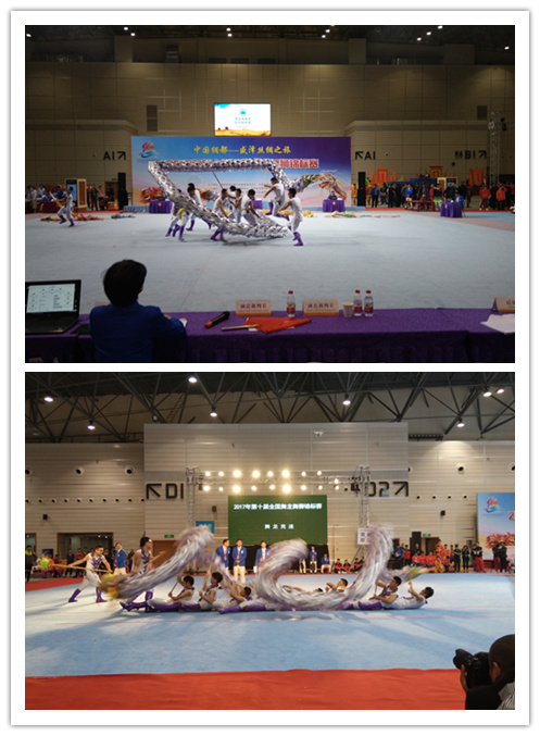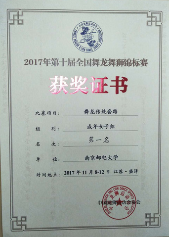 此次参赛的队员全部来自公司选修课《老员工舞龙》班上的同学,在校团委、体育部和公司领导的大力支持下,在董军老师的悉心指导下,公司龙狮团2017年5月夺得江苏省老员工龙狮精英赛女子传统舞龙冠军。为备战此次赛事,龙狮团针对目前国内各方龙狮发展的现状,认真分析研判,把主攻方向定在科技创新、套路编排和艺术表现上,尤其是在传统舞龙环节,所用器械均为自制,改进了首创的飞天舞龙,编排上将小巧的彩虹龙和五珠龙结合起来,糅合了健美操和民族舞的元素,增强了韵律感和表现力。同时,队员们利用节假日和业余时间刻苦训练,克服了时间紧,强度大、任务重、伤病多、经费少、设备缺等诸多困难,功夫不负有心人,在为期4天的比赛里,队员们团结协作,密切配合,活灵活现地将各种编排和套路完美地展现出来,一曲《飞天圆梦》技惊四座,飘逸洒脱,赏心悦目,充分展示了龙的精、气、神、韵,赢得评委认可和观众的阵阵掌声,最终以8.99分夺得冠军。