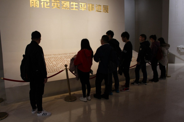 活动当天,同学们在校内集合,共同乘坐地铁到达雨花台革命烈士陵园,由北门进入,首先参观了巨型烈士雕塑群像,同学们共同瞻仰了革命烈士雕像,表达了对革命烈士的无限缅怀。沿环陵大道而上,到达了矗立在雨花台山顶上的烈士纪念碑,在长明灯前,同学们集体深鞠功默哀,以纪念无数为中国革命抛洒热血、献出生命的革命先烈。在国际歌壁面前,同学们共同学习了国际歌的创作背景与其深远意义。在中华人民共和国国歌壁面前,同学们集体唱国歌,表达了深切的爱国之情。随后,同学们参观了烈士纪念馆中陈列的1000余件烈士遗物、450幅珍贵图片,学习了挥代英、邓中夏等127位烈士的事迹和文献资料,并在馆内观看了纪录片《雨花台》,深情缅怀了革命先烈,表达了对革命先烈的崇高敬意。最后,同学们参观了忠魂亭,结束了参观雨花台革命烈士陵园之行。