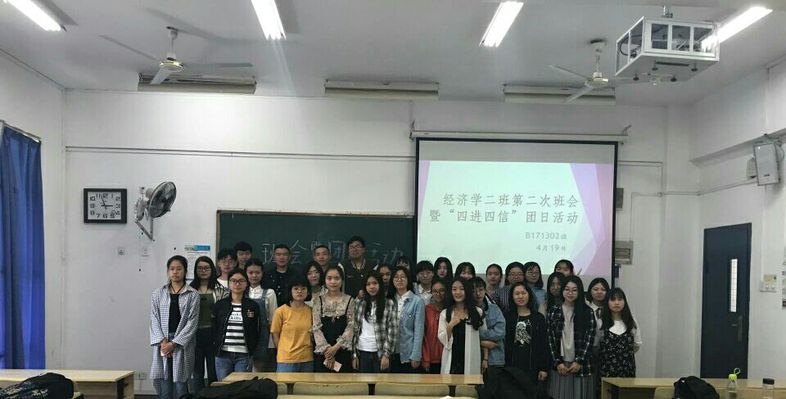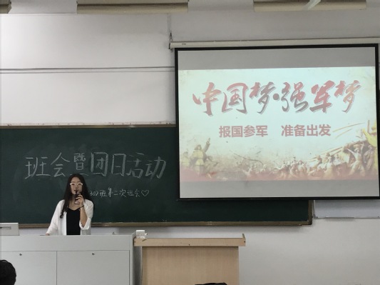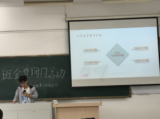 团支书苏云飞同学概括了活动流程,解释并分析了“亮团旗团徽,展团员风采”与“四进四信”的含义与意义,带领同学们更加深入地学习了十九大报告,与同学们一起分享了学习心得,希望大家能够结合“五四精神”,努力学习,莫让青春辜负了时光。班长李海艳同学就征兵问题开展宣传动员,详细介绍了征兵流程、优惠政策、报名方式,鼓励大家积极参军,为国争光。体育委员秦雪飞同学为大家强调了网络安全问题,从网络、校园等四个方面进行了详尽的说明,旨在强化并提高同学们的安全意识,契合了“安全教育月”的要求和安排。最后,班长对本次班会进行了总结,同时为近期有关活动事宜做出通知与安排。
