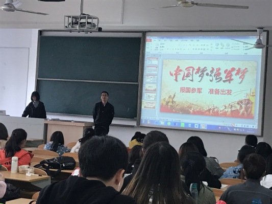 会上,郭娅如同学通过展示PPT以及视频宣传,王沪生同学就征兵的应征条件、入伍流程、优待政策进行详细阐述。重点强调了征兵于考研的加分政策,并希望同学们规划好自己的毕业去向。最后动员所有符合条件要求的同学们积极响应学校以及国家号召,强化同学们对服兵役这项义务的责任感以及保卫祖国的意识。
