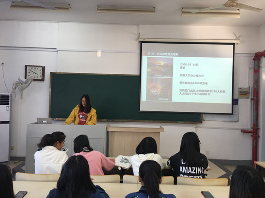 班会伊始,生活委员吴毓颖从火灾的危害及大量图文鲜明的相关案例引入,强调了消防安全知识的重要性,发人深省。在介绍了火灾的种类、预防方式以及应急应对措施后,对同学们发出了“珍爱生命,重视消防安全”的号召。班会介绍了灭火器的正确使用方法和误区,同学们积极参与讨论,分享自己所了解到的各项在教学楼、宿舍的有效消防预防措施,交流各自对校园消防安全的见解。在班会结束之际,同学们观看了一系列消防安全科普视频,在欣赏生动有趣的动画影像的同时拓展了对灭火器等消防器材的认识。