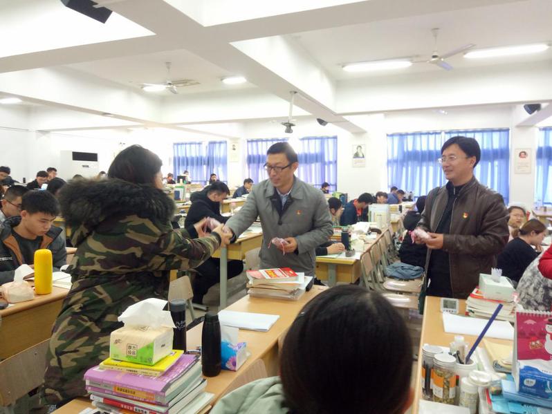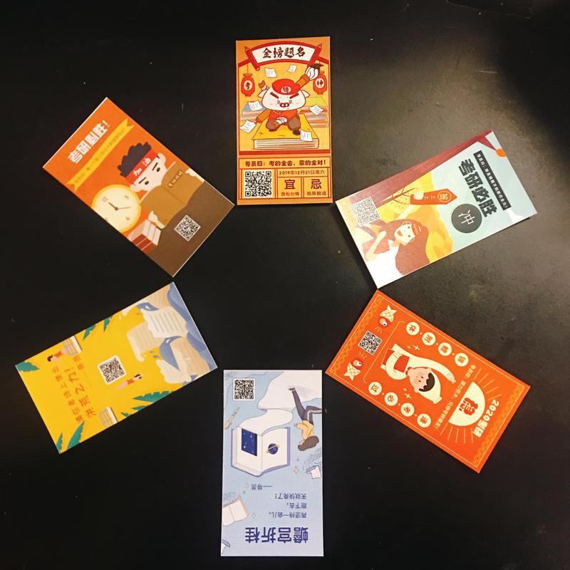 领导老师们鼓励考研学子持之以恒,坚持不懈,并亲手送上学院精心准备的锦囊和福气卡,希望大家“身揣锦囊妙计,怀抱一身运气,提笔从容淡定,考出傲人成绩”。锦囊里装满了各色助力小零食,有寓意“智慧满满”的山核桃、“能量多多”的士力架、“提神醒脑”的薄荷糖、“好事连连”的好时巧克力和“锐意进取”的瑞士糖。考研福气卡由辅导员朱蔚懿带领毕业班员工党员精心设计,印有鼓舞人心的考研祝福和励志歌曲二维码,祝福大家旗开得胜、马到成功。经院考研学子惊喜于这份冬日里的暖意,纷纷表态将一鼓作气、坚持到底、不负众望。