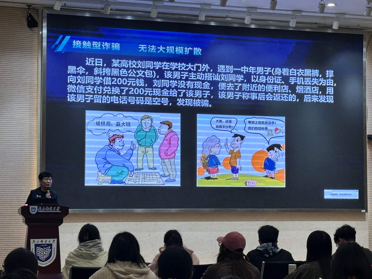 陈警官将常见诈骗手法概括为“四迷陷阱”——“鬼迷心窍”(冒充类诈骗)、“财迷心窍”(刷单投资类诈骗)、“色迷心窍”(裸聊等色诱诈骗)、“情迷心窍”(网络交友诈骗),并结合真实案例进行生动解读。在讲座中,陈红燕警官还特别针对近年来在高校中多发的“裸聊”类诈骗发出郑重警示。她将此类骗局归为“色迷心窍”型陷阱,并一针见血地指出:“裸聊就像打开了潘多拉的魔盒,看似充满诱惑,实则背后是精心布置的敲诈陷阱。”在剖析当前反诈形势时,陈警官从境外犯罪集团规模化、技术对抗升级、资金转移隐蔽、黑灰产链条复杂等多个维度,系统阐述了电信网络诈骗的六大痛点,并指出“诈骗不是简单的违法犯罪,而是社会矛盾与科技发展交织的产物”,呼吁同学们从认知层面建立起防诈屏障。