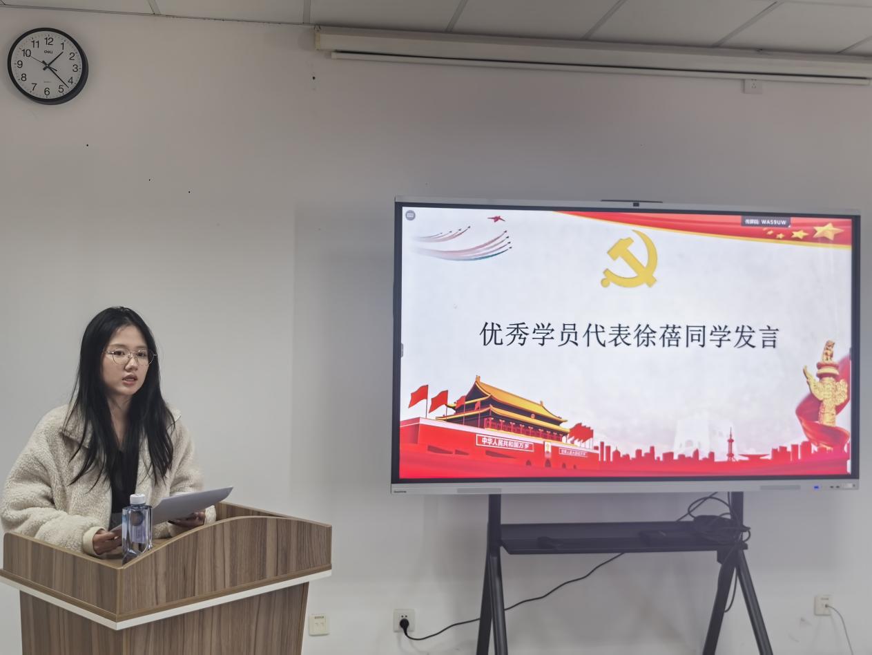 结业典礼在激昂的《国际歌》声中拉开帷幕。培训班优秀学员代表徐蓓同学发言,她结合过往学习的收获与体悟,呼吁同学们筑牢信仰之基,争做信念如磐的求知者;扛起实干之责,争做躬身力行的实干家;彰显先锋本色,争做向光而行的引领者,将所思所学转化为日常实践,以实际行动展现入党决心。随后,吴迪书记向顺利结业的学员们表示热烈祝贺并提出三点希望:一是要在深学细悟中筑牢根本,做信仰坚定的“明白人”;二是要在挺膺担当中展现作为,做服务同学的“贴心人”;三是要在时代洪流中把准方向,做胸怀天下的“赶路人”。最后,刘挺书记和吴迪书记为优秀学员颁发了结业证书。