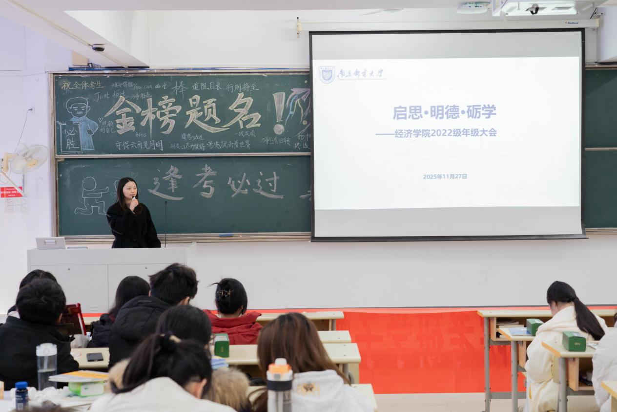 2025年11月27日下午,williamhill中文2022级于教4-201召开“启思·明德·砺学”年级大会,会议由辅导员储宜旭主讲,围绕理想信念、安全意识和学风建设展开,为处于关键阶段的本科生提供指导与支持。
