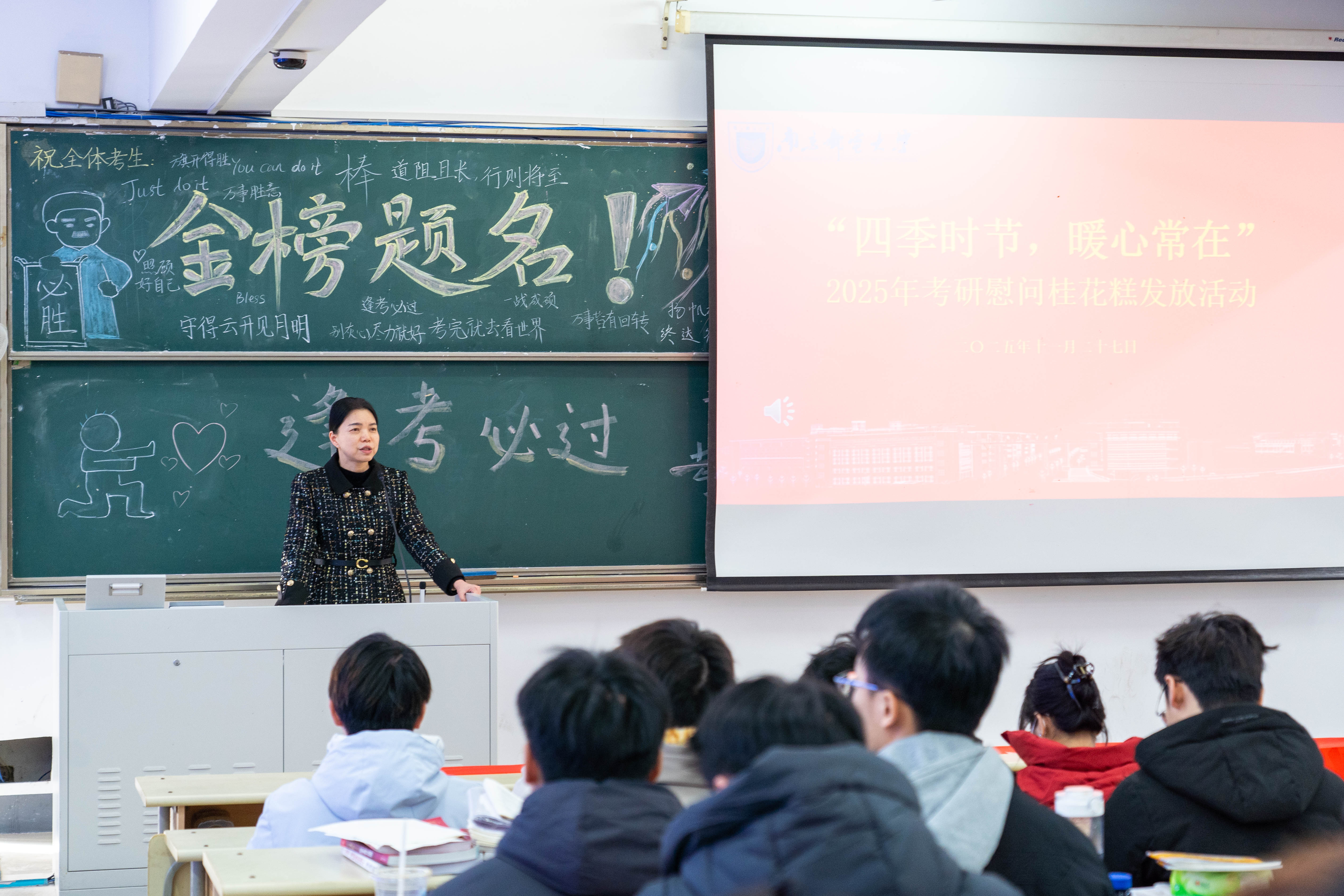 活动伊始,胡董事长首先代表学校向奋战在考研一线的williamhill中文学子致以诚挚问候,对同学们不畏艰辛、执着追梦的奋斗精神给予高度赞扬。胡董事长深情回顾了自己当年攻读博士学位时的心路历程,与同学们分享了在面对压力和困难时如何调整心态、坚持到底的真实故事。她强调,学校始终高度重视考研学子培养工作,将持续为大家提供全方位支持保障,希望同学们牢记初心、坚定信念,带着学校与学院的关怀鼓劲,沉着应战、全力以赴,在考场上发挥最佳水平,顺利实现升学梦想。