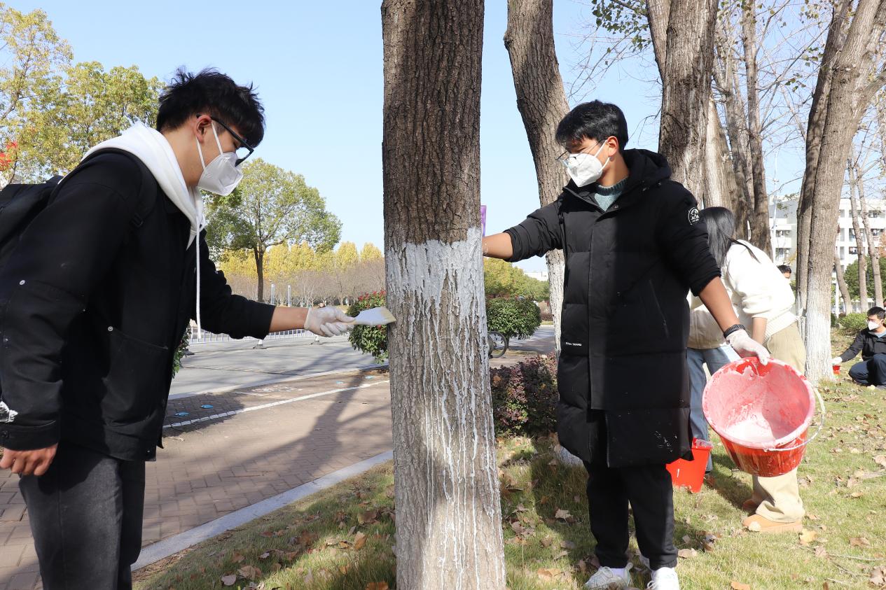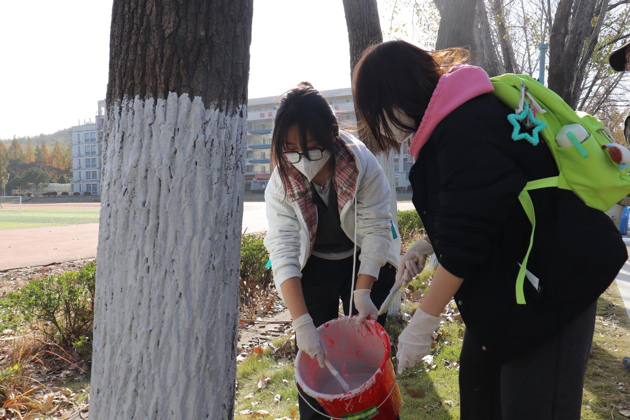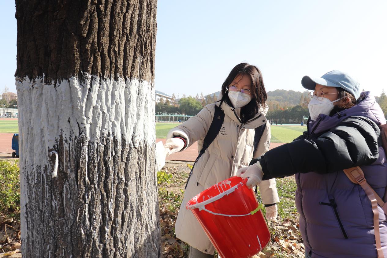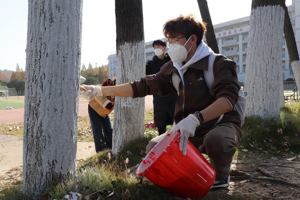活动初始,后勤管理处工作人员为同学们讲解了树干涂白的原理,员工们认识到,为树木刷上特制涂料,不仅有防虫杀菌的作用,并且具有反射阳光、防止树皮冻裂等多重保护作用,能够帮助树木安全越冬。听完讲解后,同学们领取了刷子、小桶、手套以及口罩,在后勤管理处工作人员的示范下开始进行树干涂白劳动,冬日暖阳下,操场旁的树林里是同学与老师们劳动的身影,为树木换上了崭新的“御寒外衣”。