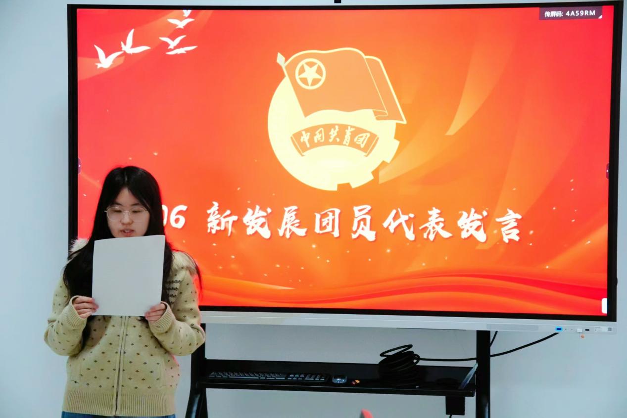 随后,吴迪副书记和尤波老师为新团员逐一颁发团员证并佩戴团徽。在朱宇露同学的领誓下,全体新团员右手握拳、高举过肩,面向鲜艳的团旗庄严宣誓,铿锵有力的誓言充分展现了新团员们践行团员使命、为党和人民事业贡献青春力量的坚定决心。宣誓结束后,丁好同学作为新团员代表发言。她表示,加入共青团不仅是一份光荣,更意味着一份沉甸甸的责任。站在新的起点上,她承诺将更加坚定理想信念,以勤学积蓄力量,以实际行动践行社会主义核心价值观,在学习与生活中勇于担当、甘于奉献,努力成为一名政治坚定、学业精进、品德高尚的合格共青团员,积极向党组织靠拢,在实现民族复兴的征程中贡献自己的青春与力量。